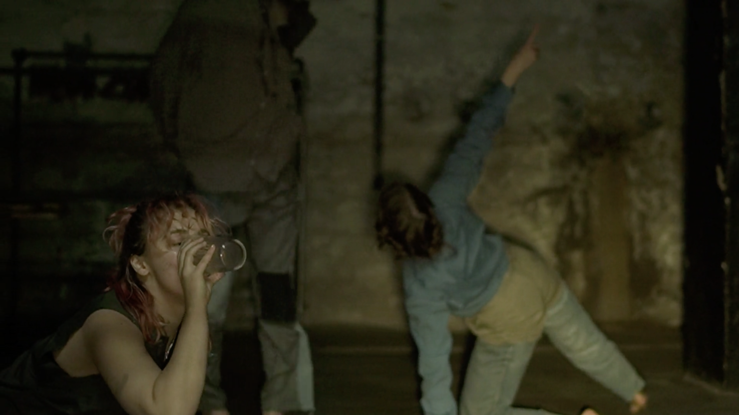 Rummet ekkoer af vejrtrækninger, klare dryplyde markerer et stabilt taktslag, tre dansere bevæger sig i enhed, væver sig ind og ud mellem de rå metalsøjler.